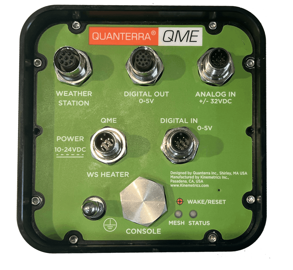 The QME is a secure wireless peripheral for the Quanterra® Q8 ultra-high resolution data acquisition system. The QME enables the mesh network capabilities of the Q8, wirelessly extending its reach to weather stations and other critical sensors.